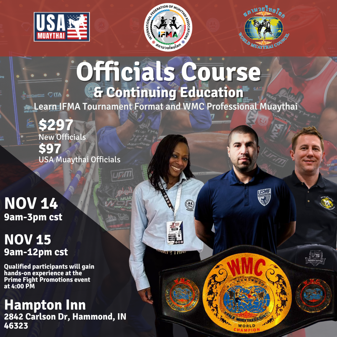 Times: OverviewA two day experience that prepares new and returning officials to work USA Muaythai Fight Nights and USA Muaythai Grand Nationals. Training covers IFMA and WMC scoring, refereeing, inspector duties, and weigh-in procedures. Qualified participants will have the opportunity to work and shadow at Prime Fight Promotions the evening of November 15. USA Muaythai is recognized by the United States Olympic and Paralympic Committee. Who Should Attend